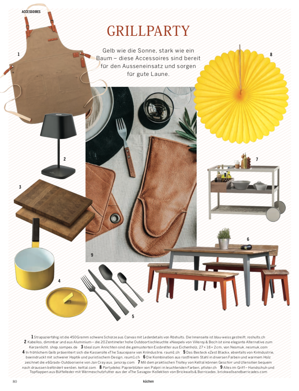 De leren ovenwant "The Savage Glove" van Brickwalls and Barricades was te zien in de special over buiten koken in het Zwitserse tijdschrift "Traumhaus".